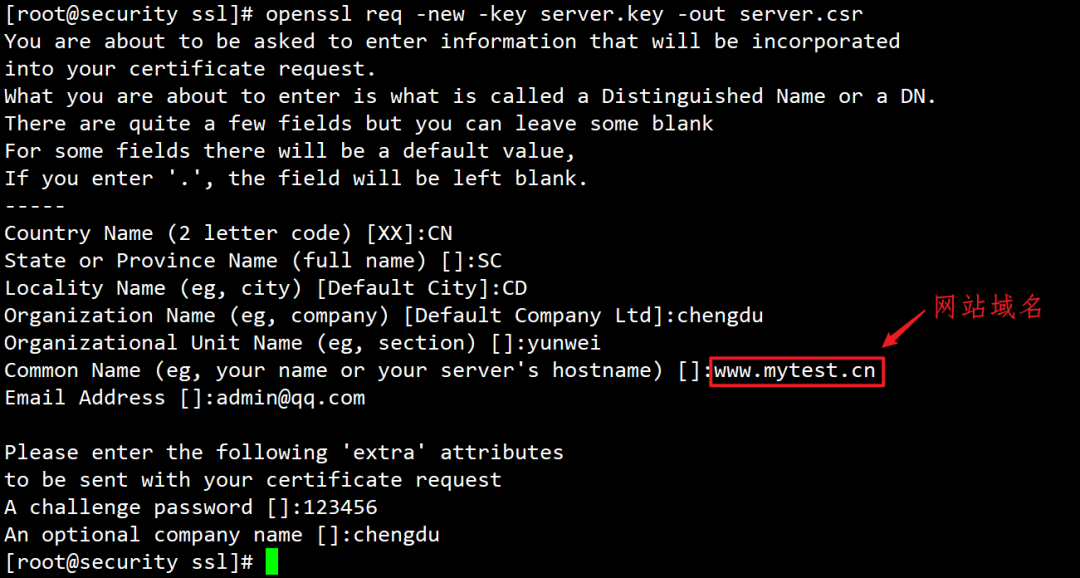 4、找到另外一台服务器,我这里只有一台服务器,到另外一个目录创建相关的证书,假如是/usr/ssl目录执行命令生成证书签署请求,其中hostname项为网站域名,其他内容都和CA证书一致openssl req -new -key server.key -out server.csr