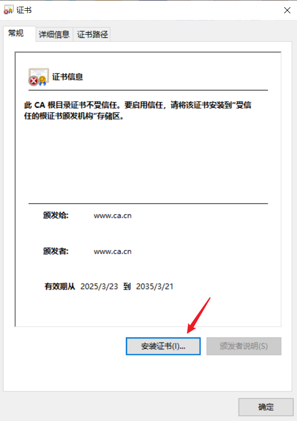 配置完成后使用nginx -s reload重新加载配置,让其生效,然后配置本地证书文件和hosts将第三步生成的CA服务器需要对外公开的证书文件cacert.pem复制到电脑本地,后缀名改为crt格式,然后双击安装证书,将其导入到电脑本地显示导入成功即可,由于www.mytest.cn这个域名没有在DNS域名服务商哪里注册,所以需要我们自己在hosts文件中添加域名解析地址,Windows电脑在C:\Windows\System32\drivers\etc下,先将hosts文件拖出来到桌面,然后修改添加如下内容在拖进去修改完成后就可以试着用https方式访问了,由于我使用了天翼云的ECS云主机,但是天翼云如果使用80或者443端口需要进行备案,所以我这里使用9443作为网页端口。这就是使用openssl工具自签发证书解决网页未使用https访问问题。