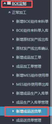 ![]() 1.进入ERP系统之后,点击“BOE定制”,点开“正常加工”,找到“新增成品送货单”。 2.进入界面之后,按图操作:点击选择销售客户,然后再点击选择送货类型。