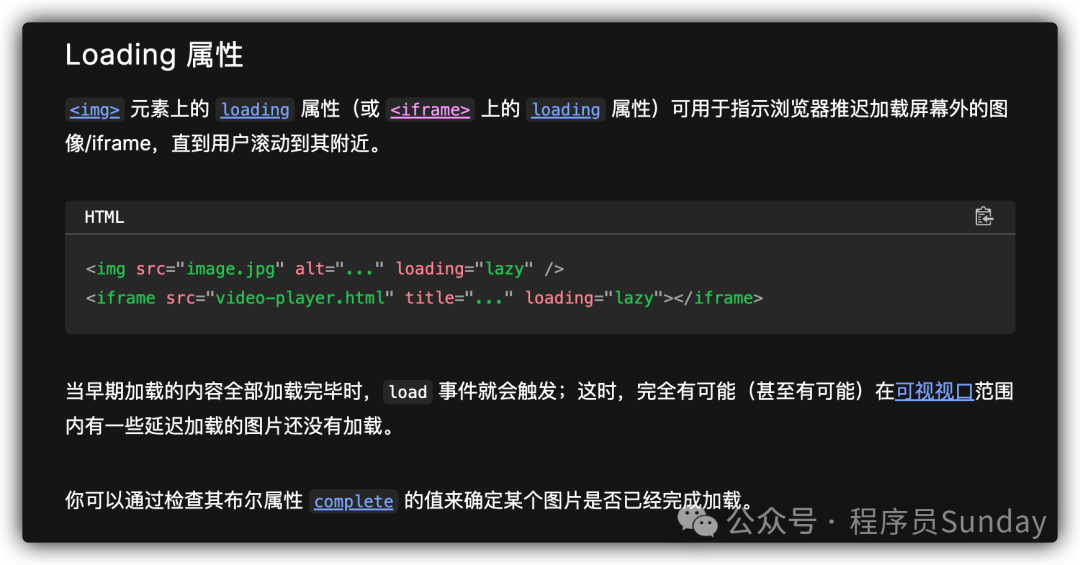 根据 MDN的介绍,我们可以很清楚的了解 <img loading="lazy"> 的作用, 很多同学在看到这个属性后都会“虎躯一震”,觉得:“这简直是完美解决懒加载的方案啊,不用写 JS 了,真香!”