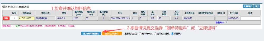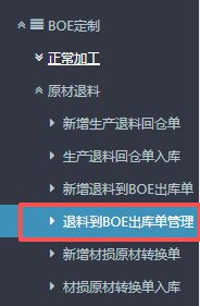2.进入界面之后,点击选择发货仓库,备注有需要可以补充。 3.接着来到下方点击“物料编码”,会弹出物料信息窗口。 在弹出窗口内,按图操作:点击选择物料大类,点击查询。然后点击对应的物料信息。 注:如果找不到物料信息可输入编号或名称筛选。 4.选好物料后,检查并确认物料信息,根据情况提交选择“制单待退料”或“立即退料” 5.提交后,回到左侧功能菜单找到“退料到BOE出库单管理” 6.进入界面后,按图操作:可用代码或名称查找,点击查询。然后点击对应物料信息,先进行出库,再上传BOE。 流程结束。 点晴模切ERP更多信息:http://moqie.clicksun.cn,联系电话:4001861886 该文章在 2025/9/18 11:41:11 编辑过 |