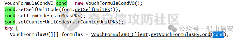 可以反向定位一下,这些传参进了哪些方法当中,可以看到VouchFormulaCondVO中保存了上面的传参,再作为cond传入了getVouchFormulasByCond