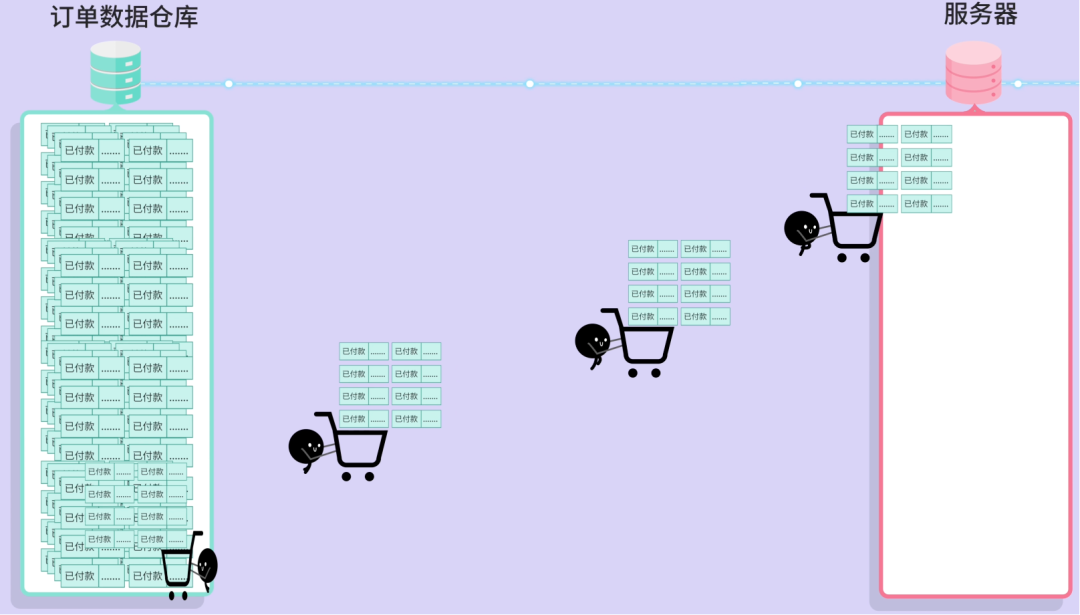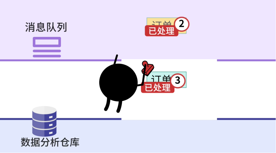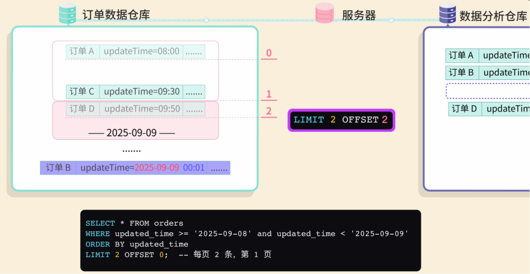 查询结果返回订单 A(08:00)和订单 B(09:00),同步完成后将偏移量调整为下一页 可就在查询下一页前,订单 B 因为 “修改订单状态” 被更新,这时订单 B 的更新时间就不在查询范围内了。 这就导致查询下一页 ![]() 怎么解决这个问题呢? 这可难不倒你小阿巴,既然 动态数据集 中使用 SQL 自带的 OFFSET 偏移作为分页起点会出问题,那不妨 自定义一个标志来记录下一批要同步的起点。 这就是游标机制。 比如我约定自增的主键 id 作为游标,每查询一批数据之后,把这批数据的最后一条记录作为新的游标值;查询下一批数据时,只查询 id > 游标的数据。 ![]() 这样不仅防止数据丢失,还避免了 OFFSET 深度分页带来的性能问题。 此外,如果把游标想象成进度条的断点,可以更清晰地记录同步进度,失败后可以从断点继续。 做完这一通优化后,你长吁了一口气,工作看来是保住了。 ![]() 性能优化你以为终于可以安稳一段时间了。但没想到,公司的好日子才刚刚开始。 随着老板大力扩张业务,公司每天的订单量可以达到百万条,你的同步任务每次要跑几个小时才能完成。 更要命的是,老板现在对数据的依赖越来越强,要求每隔 2 个小时就要同步一次数据! 怎么能够让任务执行更快呢? 这时,你想起了曾经在 程序员面试神器 - 面试鸭 上背过的各种性能优化八股文。好家伙,终于能派上用场了! ![]() 首先,修改插入数据库的操作方式。之前是一条一条地插入订单数据,改为执行一条批处理语句来同时插入同一批内多个订单数据,减少了跟数据库通信的次数,性能大幅提升。 ![]() 但是你觉得还不够快,于是优化了批处理的流程。之前是等一批同步完再同步下一批,串行执行;现在你启动了多个线程,每个线程负责处理一批订单的同步,多个线程可以同时搬砖干活,效率大幅提高。 ![]() 这一通操作下来,老板都激动了:“小阿巴,你这技术可以啊!好好干,我给你升职加薪!” 你笑了,有了老板这句话,你想继续努力给公司卖命了。 ![]() 实时同步两年后,随着你头发的消逝,公司总部决定要上市了! ![]() 老板找到了你:“阿巴阿巴,咱们的数据同步能不能做到实时?我想给投资人展示实时的业务监控。最好是用户刚下单,投资人立刻就能在大屏幕上看到!" ![]() 你早料到会有这个需求,帅气地甩出一句话:“交给我吧,我让你见识一下企业级方案!” ![]() 这两年你也没闲着,像实时数据分析这种典型需求的实现方案,你早已烂熟于心。 普通的定时任务已经无法满足实时性的要求,只能搬出 CDC + 消息队列 这两大杀器了。 CDC(Change Data Capture)就像给数据库安装了一个 24 小时实时监控的摄像头,数据有任何变化,摄像头都能立刻发现。 消息队列就像一个快递中转站。数据库变化的消息先发送到这个中转站,然后同步数据的程序从中转站取出数据并写入到数据分析仓库中。 ![]() 有了中转站后,如果消息特别多,程序来不及处理,也不会丢失数据。 实现了这套方案之后,用户只要一下单,100 毫秒内老板就能在仪表盘上看到。而且保险起见,你还给消息队列加了个监控,如果消息堆积太多,就会自动告警。 他开心得像个孩子:“小阿巴,我给你升职加薪,还给你带新人!” 你又笑了,开始幻想着你和新人坐在高高的办公桌上,你给他讲述自己光辉事迹,他向你投来羡慕的目光。 ![]() 方案完善半个月后,公司迎来了双十一大促活动。 你正在和新来的实习生阿坤吹牛皮,没想到瞬间产生了大量订单,像洪水一般,让你的实时同步系统出现了各种异常: