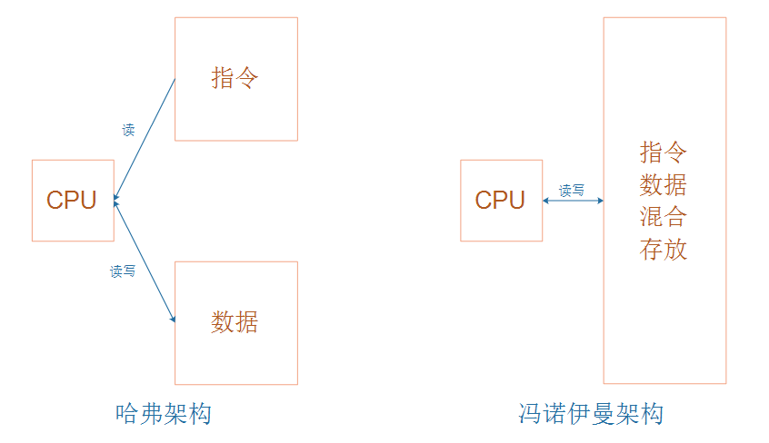 在以前的文档中涉及SoC时,意指比较复杂的系统。这时候MCU不属于SoC,因为MCU比较简单;但是时代在发展,MCU也越来越复杂了,所以把MCU也当作SoC也是可以的。 3、哈佛架构和冯诺伊曼架构CPU架构可以分为哈弗架构与冯诺伊曼架构。 (1)哈佛架构